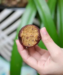 Bolita en base a castañas de cajú, harina de coco, dátiles, leche de coco, agave orgánico, zeste y jugo de limón.